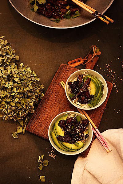 En ésta ocasión he acompañado las tiras con unos noodles y un aguacate cortado en láminas finas, pero podéis presentarlas con arroz o tal cual, a mi particularmente es como mas me gustan, en plan picoteo, con un vino o una cerveza, no sé si esto es lo más heterodoxo, pero es como mas lo disfruto.