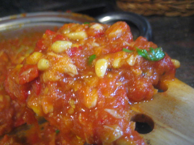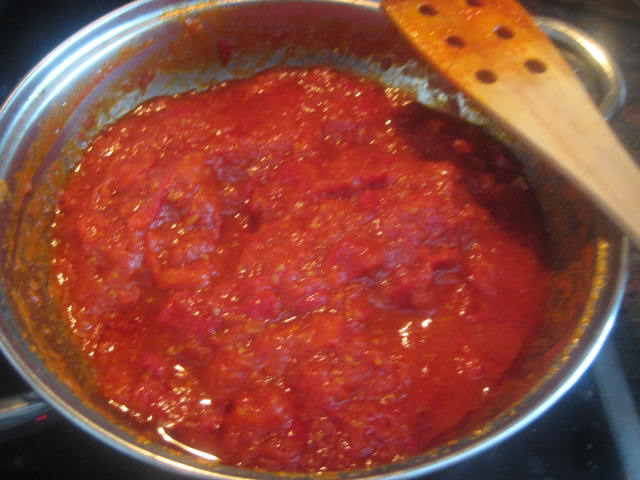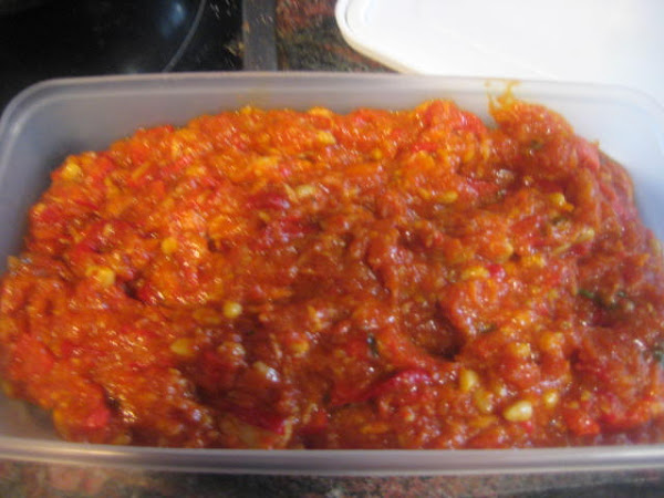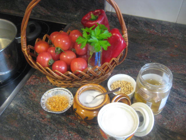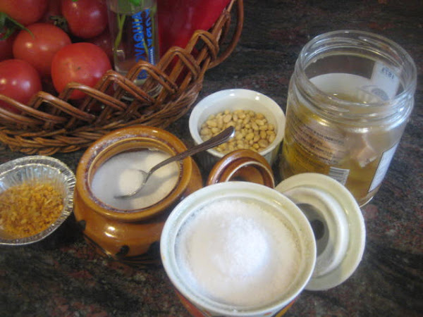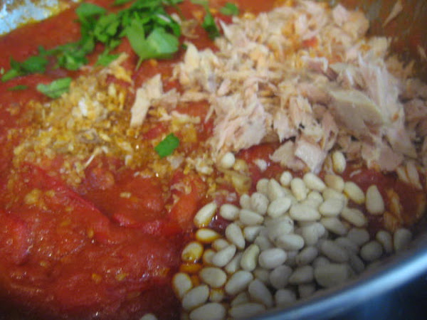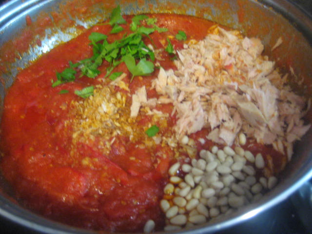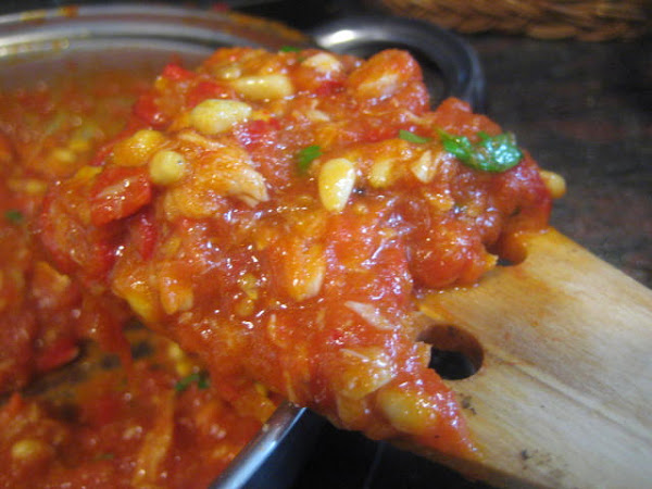 Preparación: Laminamos los ajos y los sofreímos en aceite de oliva. Cuando empiecen a coger color, los sacamos. - Tostamos los piñones y los reservamos. Escaldamos los tomates para poder pelarlos más fácilmente. Después los rallamos o cortamos, sin que queden hechos puré. Sofreír el pimiento rojo troceado, después añadir el pimiento verde y cuando estén pochados, el tomate. Añadir sal y un poco de azúcar. Dejar a fuego medio durante 30 minutos pero eso va a depender del tipo de tomates que tengamos. Si son muy acuosos, como los míos, habrá que prolongar el tiempo de cocción. Yo los he tenido que tener 1 hora. Antes de apagar el fuego, echar los ajos laminados, los piñones y la tonyna de sorra troceada o el atún o bonito en aceite bien escurrido y desmenuzado y un poco de perejil picado,dar un par de vueltas y retirar del fuego. Una vez fría la guardamos en la nevera y nos sirve para: