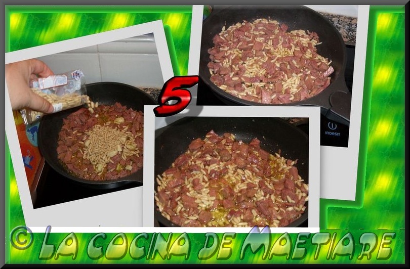 Añadimos los piñones,mezclar bien y sofreír 2 minutos más