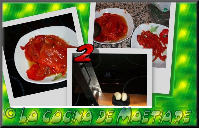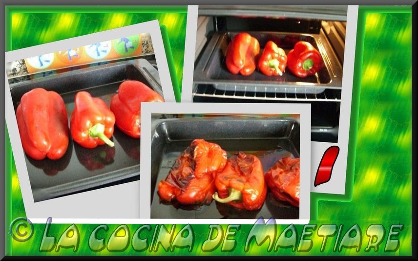 Primer paso untar de aceite los pimientos, eso lo puedes hacerlo con las manos para así repartirlo por toda su superficie y asar los pimientos en el horno hasta que estén asados. Sacarlos del horno, colocarlos en un recipiente y taparlos para que suden(eso ayudará para quitarles la piel). Yo lo solía tapar con unas hojas de periódicos, pero se puede usar papel de horno o un paño