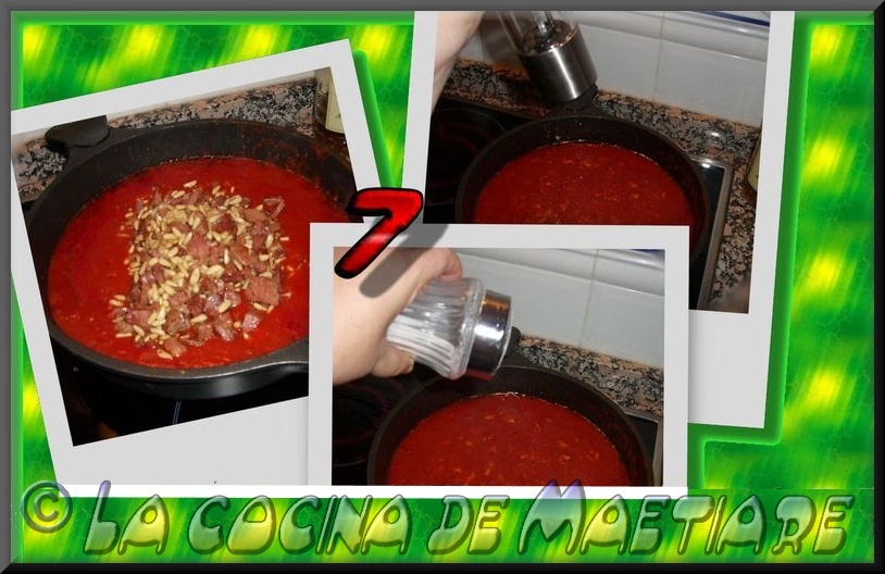 En el mismo aceite añadimos el tomate triturado y le añadimos una cucharadita de azúcar moreno para quitar la acidez del tomate. Cocinamos a fuego medio bajo tapado hasta que reduzca un poco.