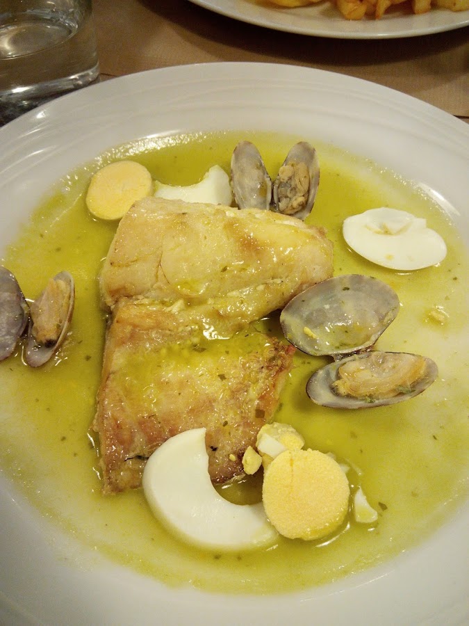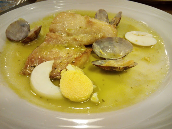 Dar la vuelta a cada lomo de pescado, con cuidado para que no se rompa la piel, y dejar cocinar otros 4 minutos a fuego lento, moviendo de vez en cuando la cazuela. Espolvorear el perejil, cortado fino y servir caliente. Para decorar el plato podemos añadir huevo cocido cortado en láminas, pero este punto es opcional y al gusto.