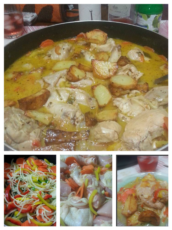 Cuando las verduras están a punto , agregar la sidra e ir mezclando. Condimentar. Cocinar unos minutos e incorporar las presas de pollo reservadas.