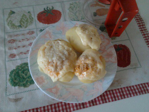 Las patatas se pueden rellenar de cualquier cosa: de bonito con tomate, de carne picada, de jamón y queso. Eso será al gusto de cada uno, o para variar según la temporada en que las hagas.