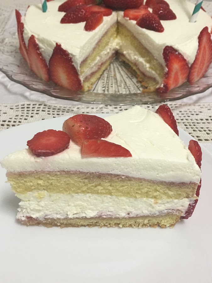 He sorprendido a mi hija con esta tarta de fresas y crema para su cumpleaños. A ella le gustan mucho las fresas con nata (crema de leche). Aprovechando la mermelada de fresas casera que había hecho, y que estamos en temporada, pensé: ésta seguro que le encanta!