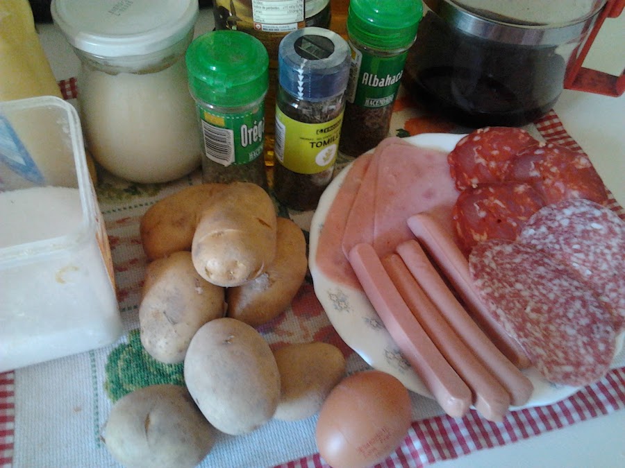 rodajas de 1/2 cm. Picamos las salchichas y el resto de fiambre y lo salteamos con un poco de aceite.