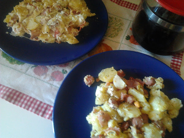 Mezclamos las patatas con los huevos y las salchichas salteadas.