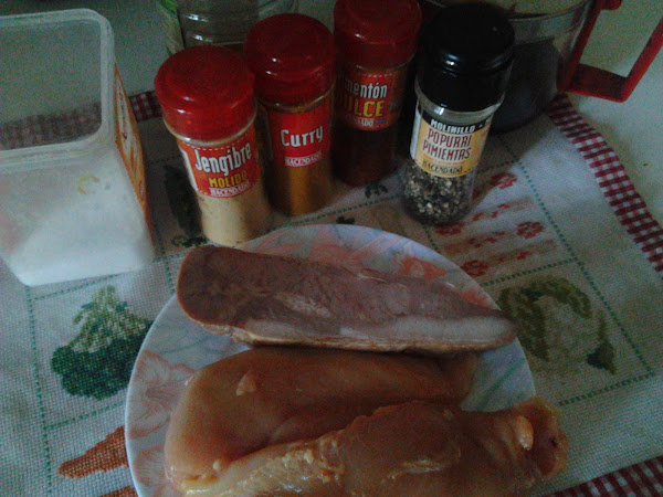 En un cuenco ponemos la carne de pollo y le añadimos sal, pimienta, gengibre, curry, pimentón (todos estos ingredientes al gusto, ya que el curry puede dar un sabor picante que no a todo el mundo le gusta) y un chorrín de aceite. Lo mezclamos todo bien, que quede impregnada toda la carne.