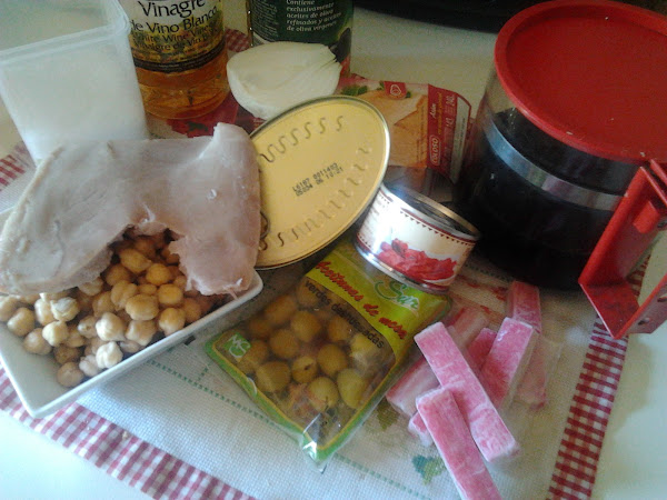 Vamos picando los ingredientes: la cebolleta bien picadina y fina, los pimientos, los palitos y las aceitunas a la mitad. Se junta todo en un bol y se le añaden los garbanzos.