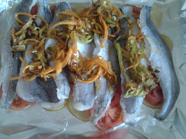 En la fuente del horno, ponemos papel de aluminio, un trozo el doble de largo o más que la fuente. Y empezamos a colocar los ingredientes por capas: primero las patatas y las sazonamos; luego los tomates y volvemos a sazonar y por último el pescado y también añadimos sal, los cubrimos con la fritada de puerro y zanahoria y le añadimos el aceite de freírlo ( si nos quedamos cortos, podemos echar un poco más de aceite de oliva) y un chorro de vino blanco.