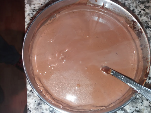 Cuando lo tenemos lo colocamos sobre el chocolate (como siempre suelo decir cuando se trata de poner una capa sobre otra hay que verterlo sobre una cuchara o espátula para que no haga mucho hueco)