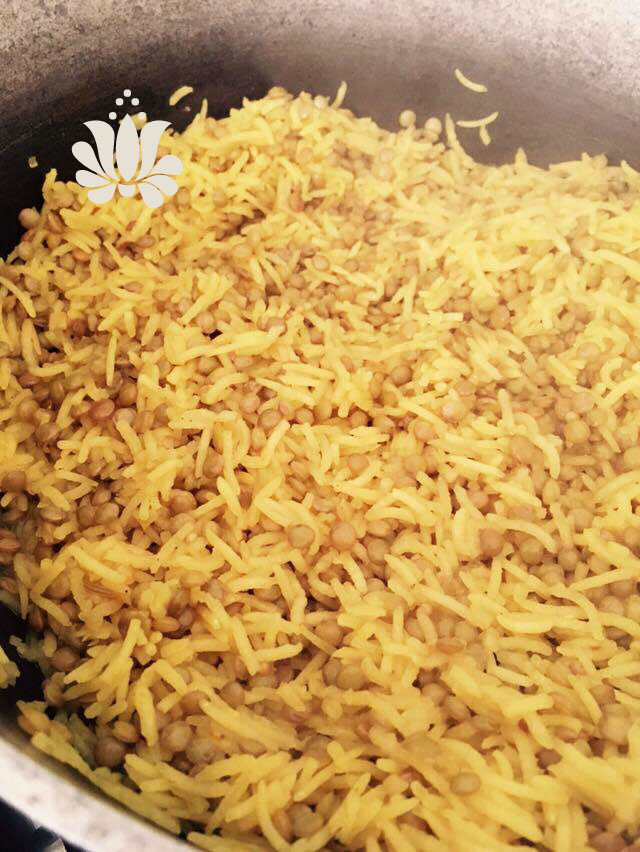 Para una taza y media de arroz y lenteja o mung agrega 3 tazas de agua, cuando rompa el hervor incorporar la mezcla de arroz con lentejas o mung y bajas el fuego.