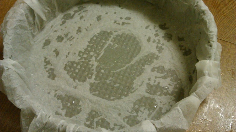 Forramos el molde con papel de hornear. Para que se acople bien, mojamos un poco el papel con agua y retiramos el exceso. Se vuelve manejable y se adhiere al molde con facilidad.