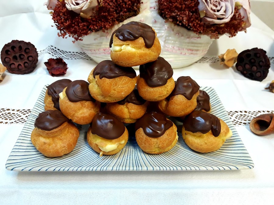 Rellenamos los profiteroles con la manga pastelera y con una cuchara les vamos cubrimos por encima con el glaseado.