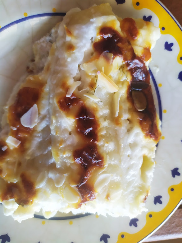 Yo he elegido un rico Bacalao Gratinado con ali-oli, que está para mojar pan y montarle un piso. Además, he cogido la idea de ponerle almendras por encima de otra receta suya de bacalao, el Bacalao gratinado con almendras.