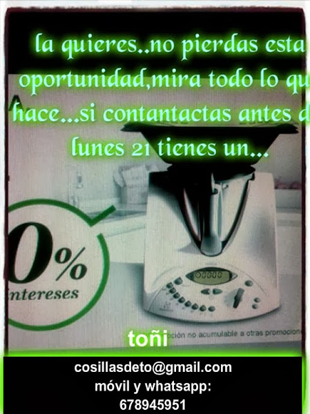 Mas de uno seguro que ya la conocéis,thermomix,si queréis que os la presente, os la lleve a casa y os haga una demostración culinaria ..SIN COMPROMISO...NO IMPORTA EN QUE LUGAR DE ESPAÑA,ESTÉS,PREGUNTA ME?