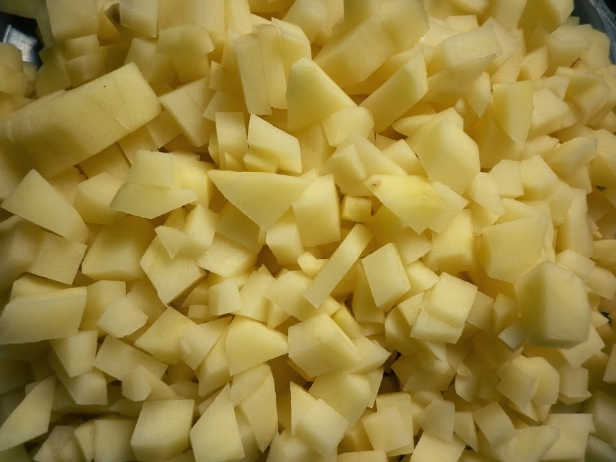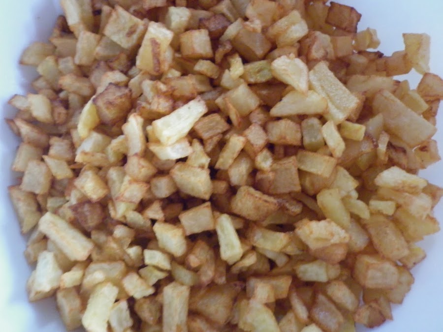 · Ahora pasamos a la guarnición. Cortamos a cuadritos pequeños las patatas, el apio, el puerro, las zanahorias. Freímos primero las patatas y después las verduras.