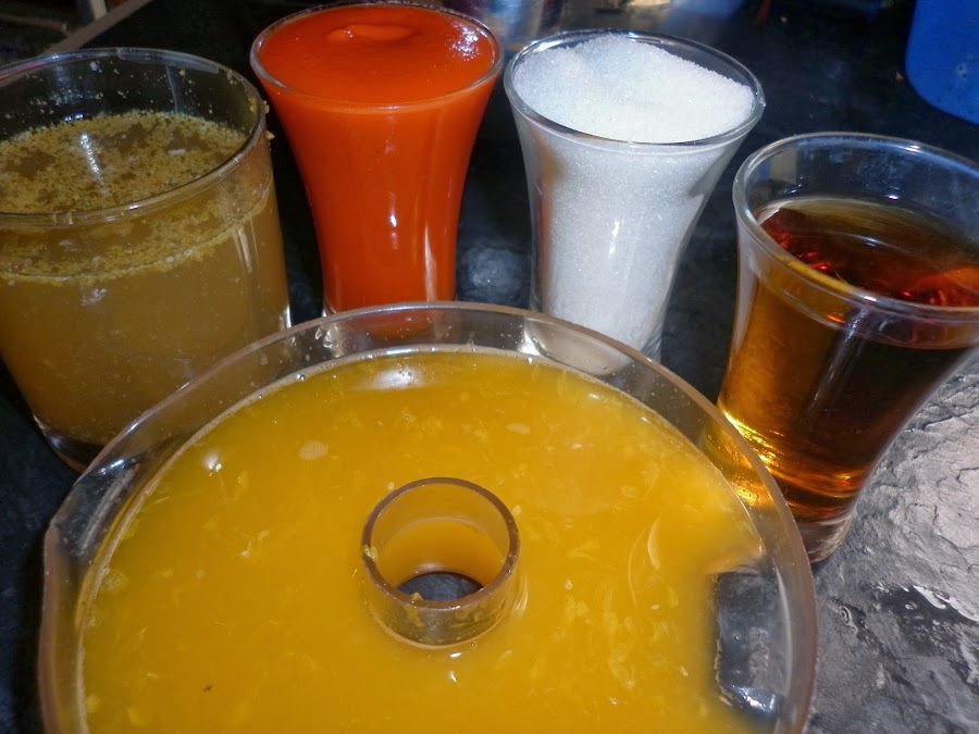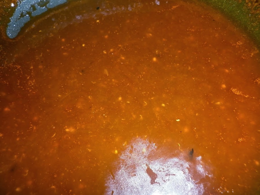 En el tercer elemento vamos a hacer la salsa agridulce; En este caso he utilizado una sartén en la que he mezclado el zumo de naranja, el caldo de pescado, el tomate frito, el azúcar y el vinagre. Lo reducimos hasta quedar espesito. Rectificamos de sal.