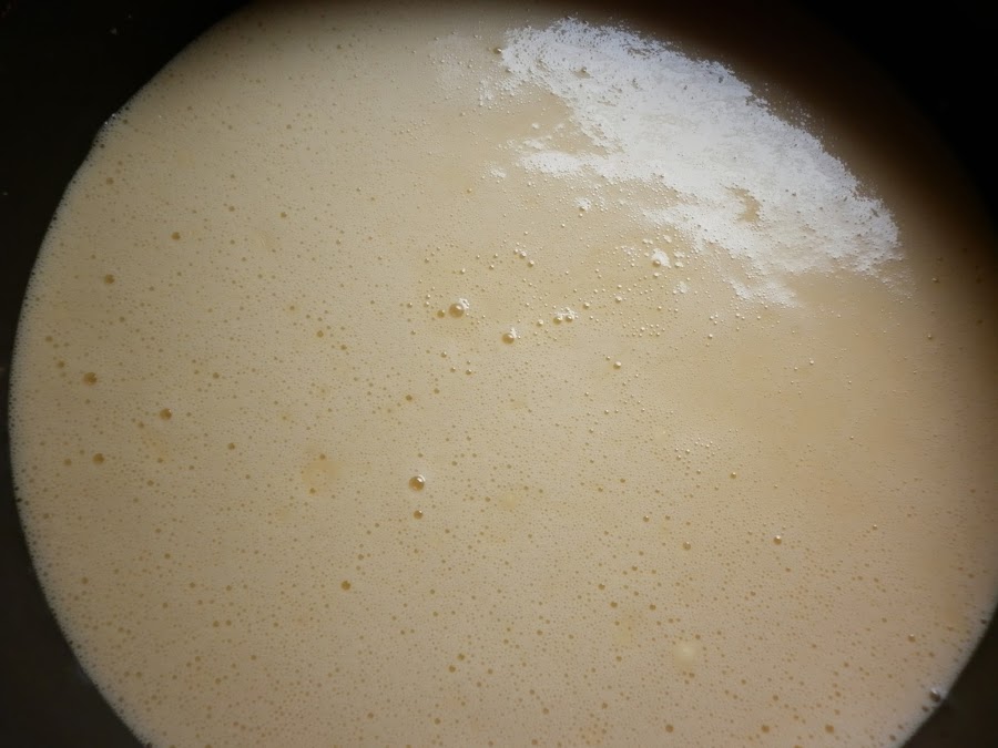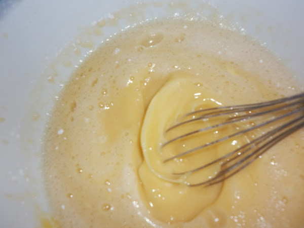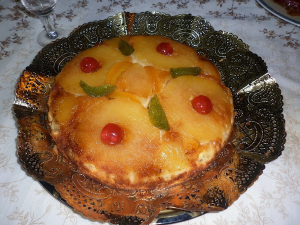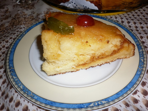Hacemos la masa para el bizcocho, batimos los huevos y el azúcar, muy bien batido si tenemos alguna varilla eléctrica entrará más aire en la masa y quedará más esponjoso. Después le agregamos la harina con la levadura previamente mezclada, poco a poco, no de golpe, cuando esté bien incorporada a los huevos se añade el ron y el zumito de la piña, se sigue batiendo un rato hasta que se ponga bastante espumoso.