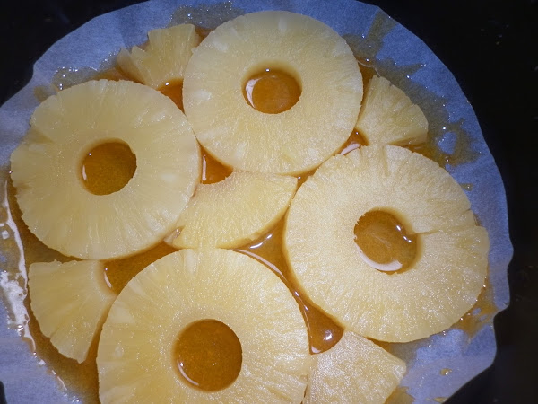 Una vez conseguida este punto al azúcar se vierte en el fondo del molde, y antes de que se haga caramelo duro se ponen las rodajas de piña en almíbar. Se aparta este molde y pasamos al segundo paso.