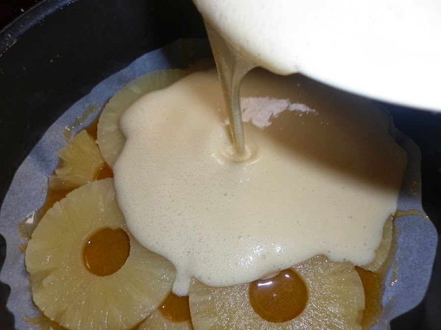Se vierte encima del molde que hemos preparado antes con las ruedas de piña y el azúcar caramelizado.