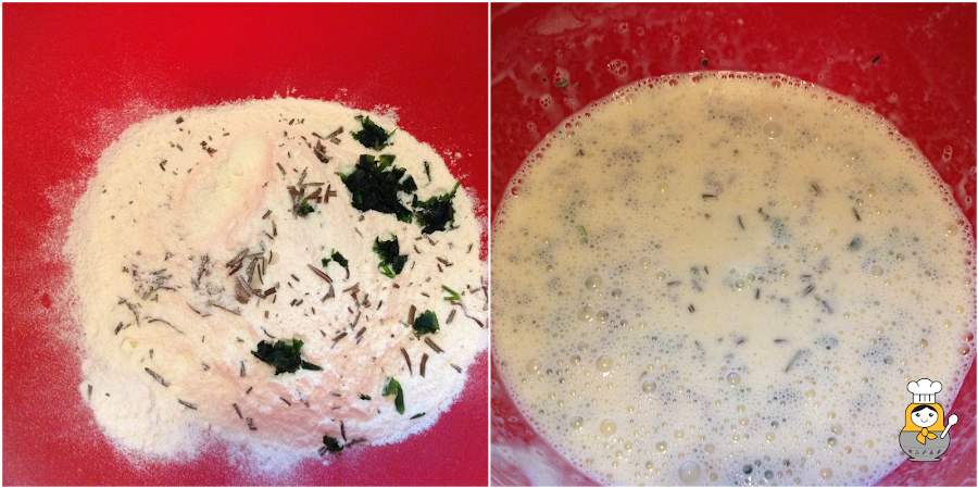 Para hacer el pudin, en un bol, mezclamos los ingredientes secos, es decir harina, las especias y la sal. Hacemos un hueco en el medio y añadimos el huevo batido. Empezamos a revolver. Una vez incorporado el huevo, vertemos poco a poco sobre la masa la leche y el agua. Batimos bien todo hasta que todos los ingredientes estén bien mezclados y dejamos reposar durante 30 minutos (antes de usarla, volveremos a revolverla bien).