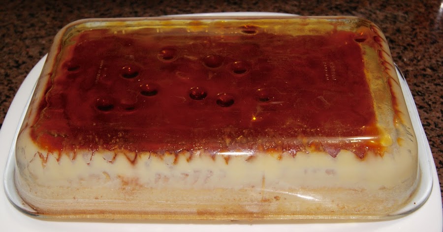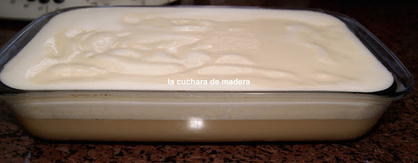 Ponemos esta mezcla sobre la que ya habíamos puesto en la bandeja con cuidado; como se aprecia en la foto no se mezclan la primera parte de elaborar con la segunda.