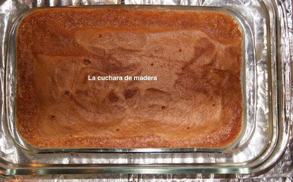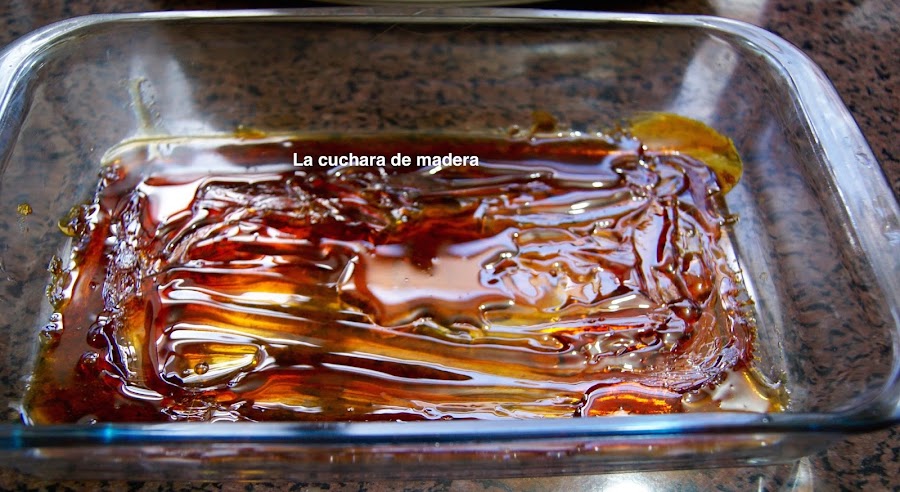 Por último el azúcar y volvemos a batir. Esta mezcla la ponemos en la bandeja del horno que tenemos con el caramelo