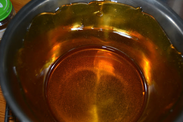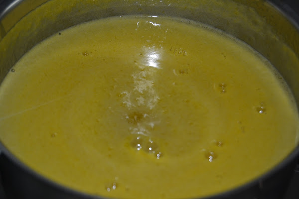 Ponemos en un cazo al fuego los dos vasos de azúcar y el vaso de zumo de naranja. lo tenemos hirviendo unos cinco minutos y apartamos. Dejamos templar.