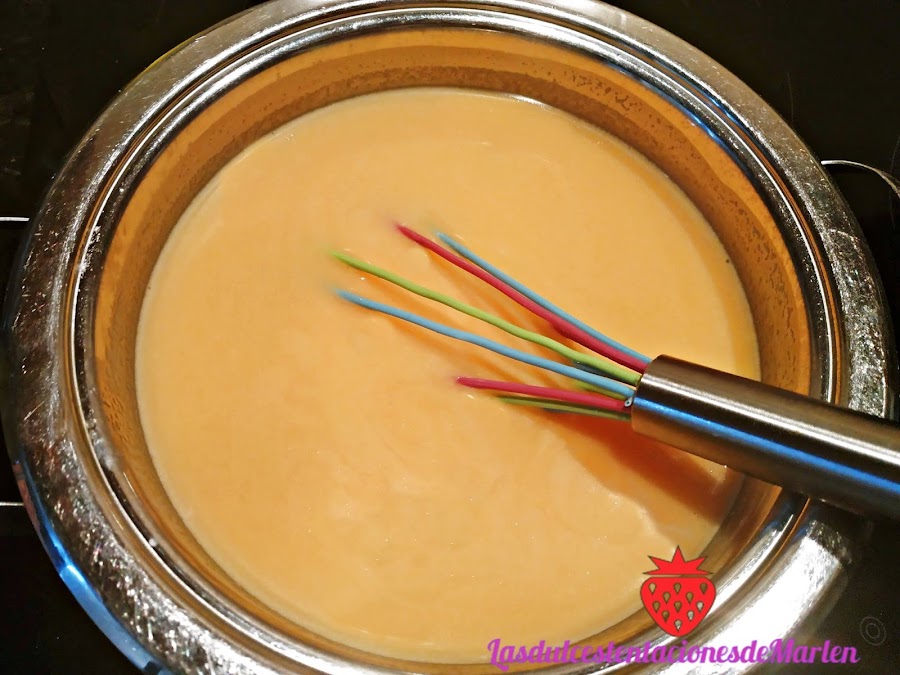 Ponemos el resto del zumo, la nata (crema de leche) y el azúcar al fuego y cuando rompa a hervir añadimos la mezcla de zumo y gelatina y apartamos del fuego (yo lo he batido todo muy bien con varillas manuales).