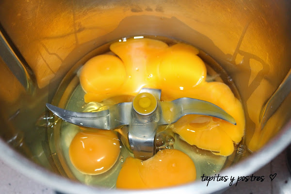 Colocamos los huevos y las yemas. Lo batimos bien.
