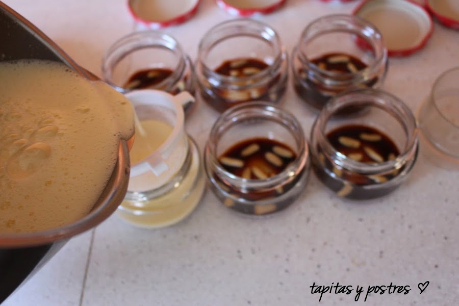 Sacamos la mezcla y vertemos a través de un colador sobre los moldes. Yo he usado unos de cristal con tapa de rosca.