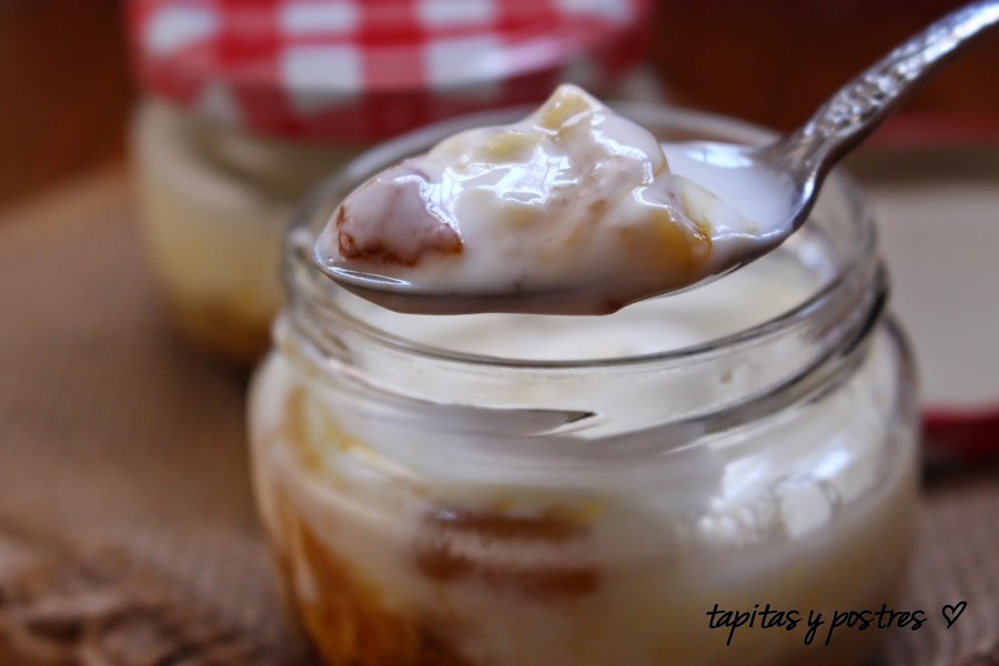 Cuando ya estén bien fríos y vayamos a servir ponemos por encima dos cucharadas bien llenas de yogur cremoso azucarado. Yo he usado el de mercadona que viene en tarros grandes.