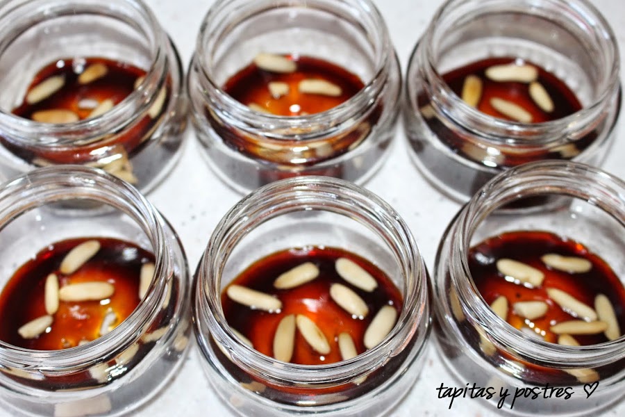 Vamos a caramelizar los moldes donde vayamos a presentar el postre. Yo he usado unos tarritos de cristal que tienen tapa de rosca y se conservan muy bien. Añadimos un puñado de piñones sobre el caramelo. Reservamos.