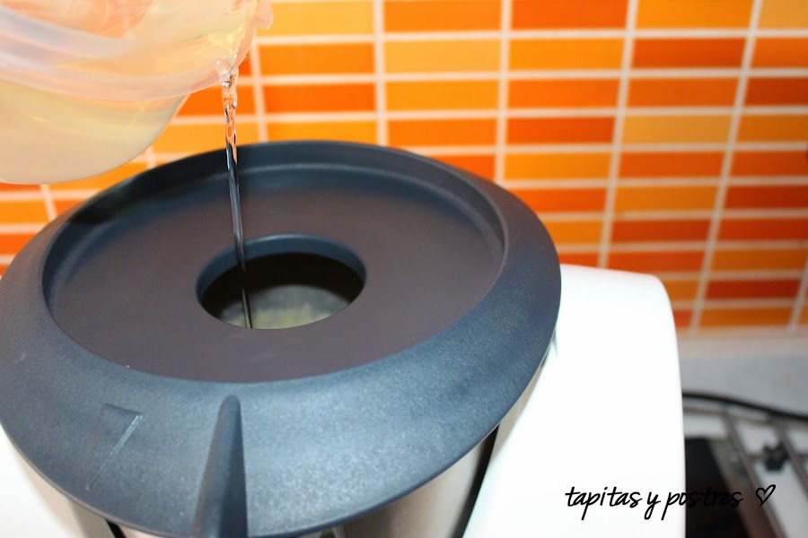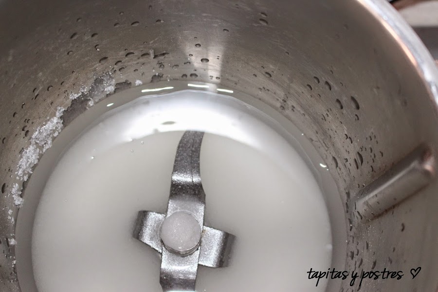 Hacemos un almíbar con el agua y el azúcar programando 11 minutos, varoma, velocidad 2. Sacamos y reservamos para que se enfríe.
