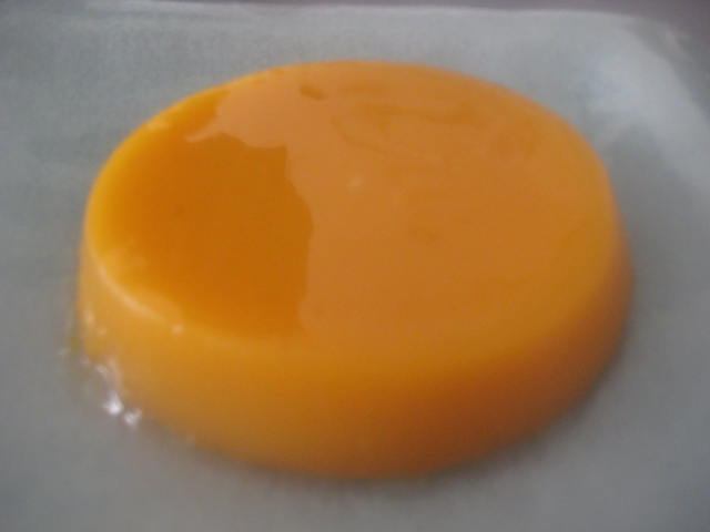 Preparación: Con el zumo de naranja, el azúcar, la corteza de naranja y la glucosa hacer un almíbar a punto de hebra fino, es decir mantenerlo cociendo 4 minutos desde que empiece a hervir . Cuando esté hecho retirar del fuego y pintar con él el fondo y las paredes de un molde redondo y bajito, o de un molde bajo y alargado o, si se desea, flaneras individuales de tamaño más bien pequeño, porque este postre no se come en mucha cantidad. Una vez almibarados nuestros moldes elegidos, reservar y dejar que el resto del almíbar se enfríe Partir las yemas una vez bien desclaradas, esto quiere decir que no se batan muy fuerte para que no formen espuma, y añadir poco a poco el almíbar de naranja templado o frío. Pasar la crema obtenida por un chino o colador y llenar el/los moldes. Cocer al baño María sobre el fuego o al horno, hasta que esté hecho; unos 25-30 minutos aproximadamente, aunque dependerá del tamaño del molde y del horno. Puede ser interesante taparlos con papel de aluminio los primeros 15 minutos. Una vez hechos dejar enfriar en el baño maría y luego pasar a la nevera. Ya fríos desmoldar y decorar, si se quiere al gusto.