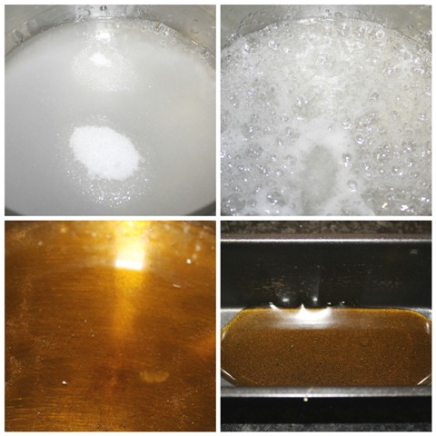Vamos a preparar el caramelo, pondremos el azúcar y el agua a fuego lento e iremos removiendo (con cuchara de palo sobretodo, que yo ya tuve una mala experiencia con el plástico), hasta que se haga el caramelo, es decir que veamos que toma un color marrón dorado. Sin esperar ni un momento lo incorporaremos a la base de los moldes donde vamos a poner la mezcla (si esperáis se endurecerá y no lo podréis trabajar).