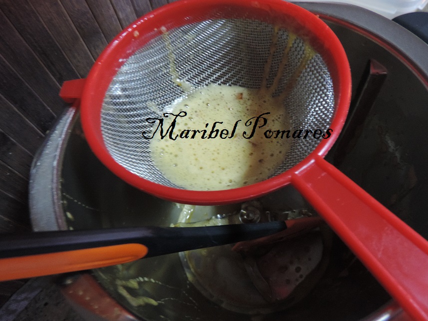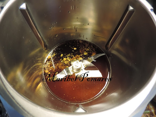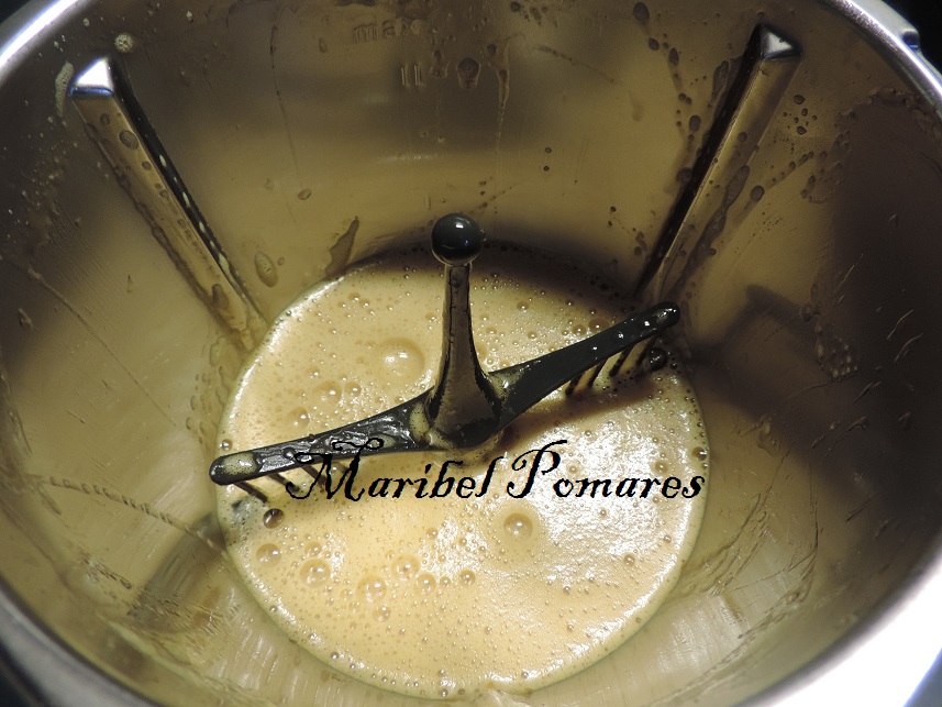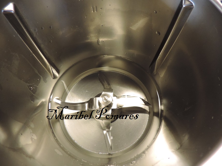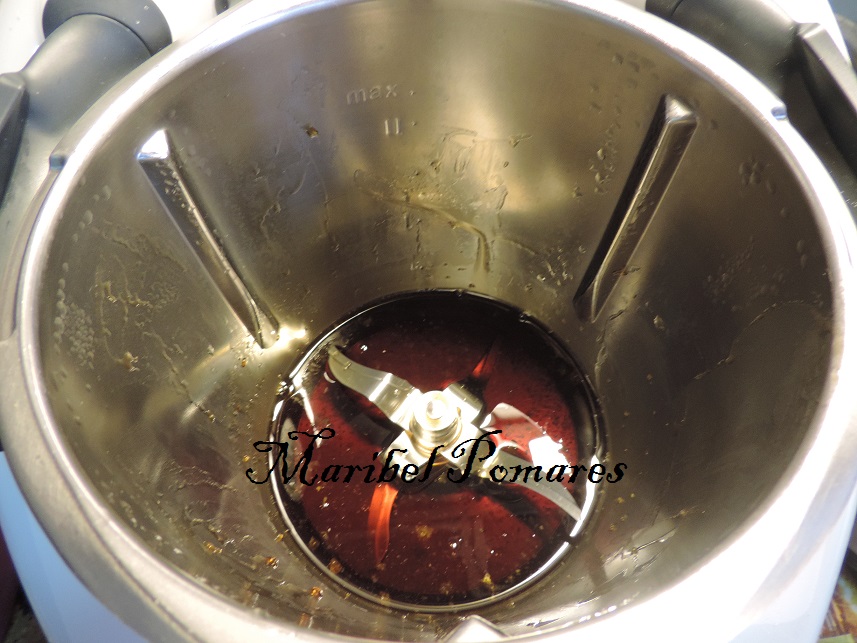 Programamos 30 segundos, velocidad 2 y 1/2, y vamos añadiendo poco a poco por el vocal el almíbar reservado.