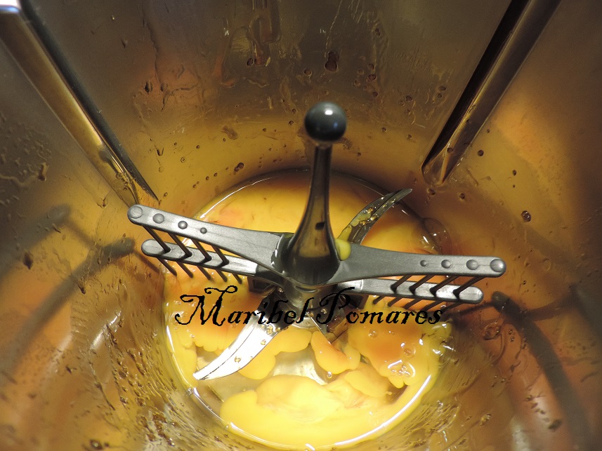 Poner la mariposa en las cuchillas, echamos las yemas y el huevo entero.