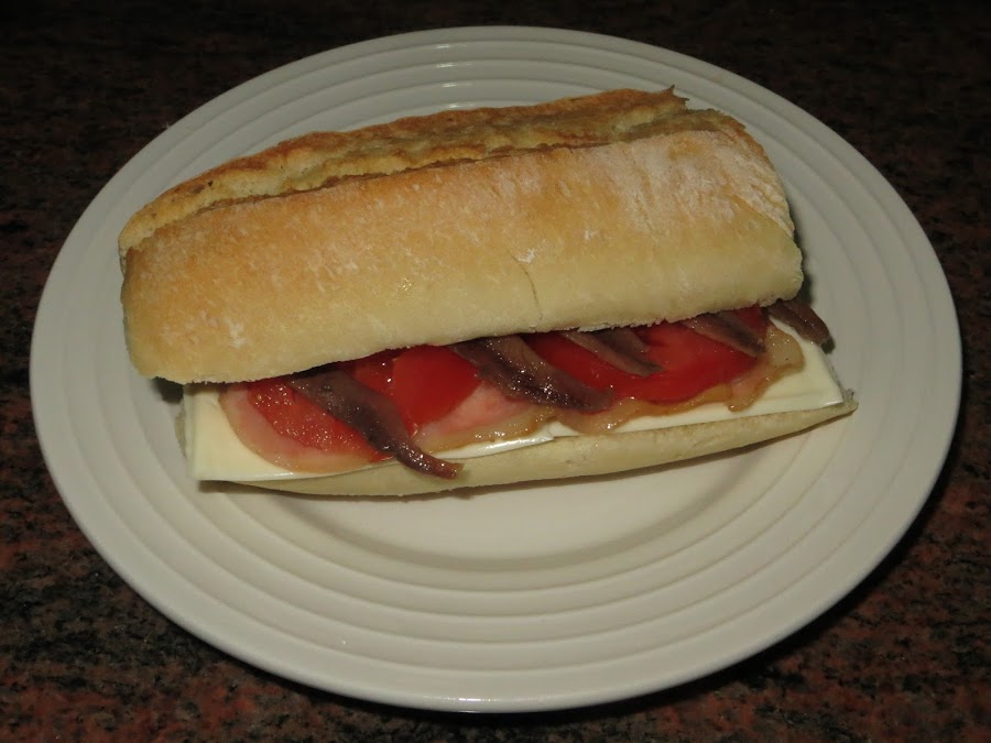 Abrimos el pan y colocaos en una parte el tomate y las anchoas y en la otra el queso y se le echa el bacon recién cocinado encima para que se derrita un poco. Tapamos el bocadillo y listo para comer. Es un bocado que sorprende por mezclar el sabor de las anchoas y el bacon.