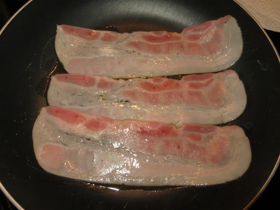 Echamos un pelín de aceite en la sartén para dorar el bacon. Mientras tanto vamos cortando el pan en rodajas y el queso (aunque en este caso he utilizado tranchetes así que no hace falta).