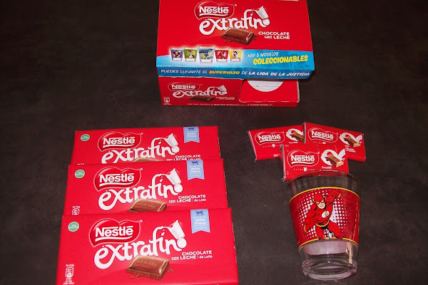 Para terminar el mes dulcemente recibí un pack de la liga de la Justicia por parte de Chocolates Nestlé formado por 3 tabletas de chocolate extrafino, 3 chocolatinas y un vaso de la campaña.