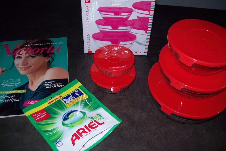 En esta foto podéis ver la revista Victoria que me llego a casa con una muestra de Ariel 3en1. También os enseño 5 recipientes de cristal con tape rojo que pedí en Nicequest. Tengo varios juegos y son muy prácticos para guardar alimentos en la nevera.