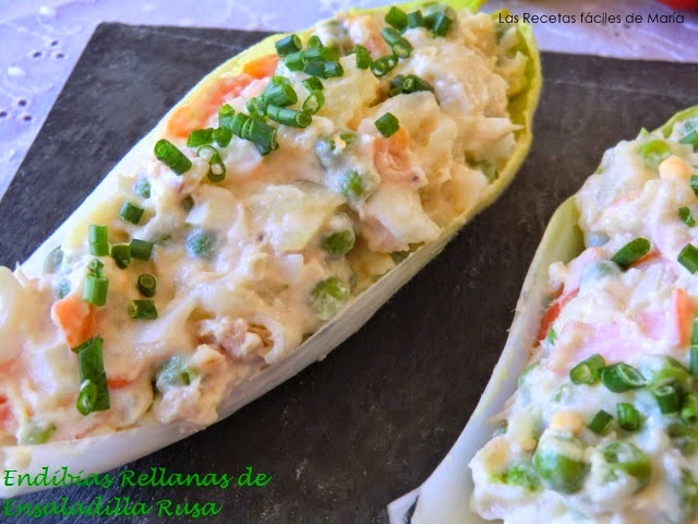 VER RECETA: http://www.lasrecetasfacilesdemaria.com/2014/06/endibias-rellenas-de-ensaladilla-rusa.html