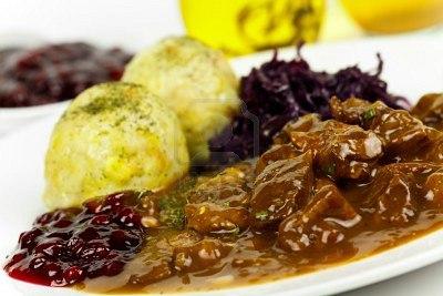 Venado con setas o con peras: -Se fríe el venado en una sartén con mantequilla derretida y se flambea con brandy. El añadido final de las setas se acompaña con vino tinto para dejarlo cocer.