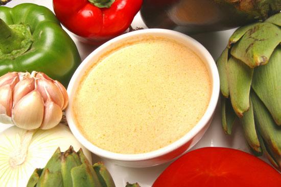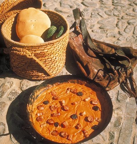 Sopas de ajo (castellana): Caldo hecho en cuenco de barro a base de ñoras, ajo, aceite, pimentón y jamón. Se le añade pan y huevos.