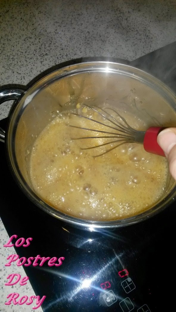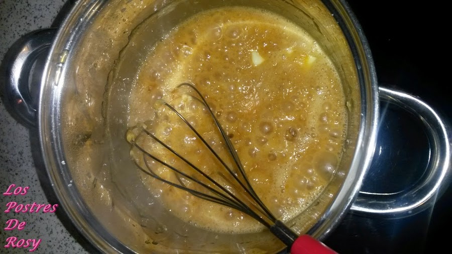 - Una vez esté bien integrada la mantequilla, apagamos el fuego y seguimos batiendo (aprovechando el calor residual). El toffee estará listo cuando notéis que está más espeso y forme burbujas grandes.