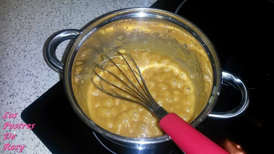 - Cuando el azúcar caramelice, apartamos del fuego y ponemos la nata (crema de leche) tibia (¡ojito que salpica y quema mucho!), llevamos de nuevo al fuego sin dejar de batir.