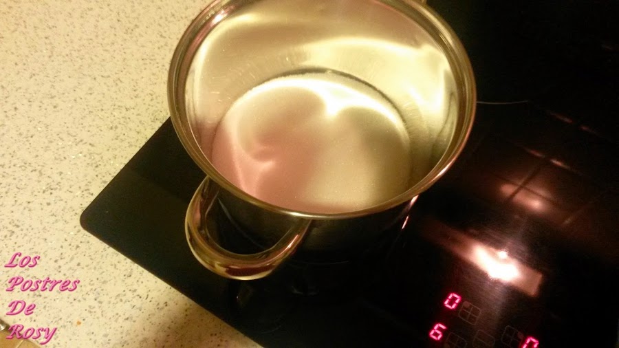 - Derretimos el azúcar en una cazuelita, a una potencia media alta (mi placa tiene 9 puntos de potencia, lo puse al 6).