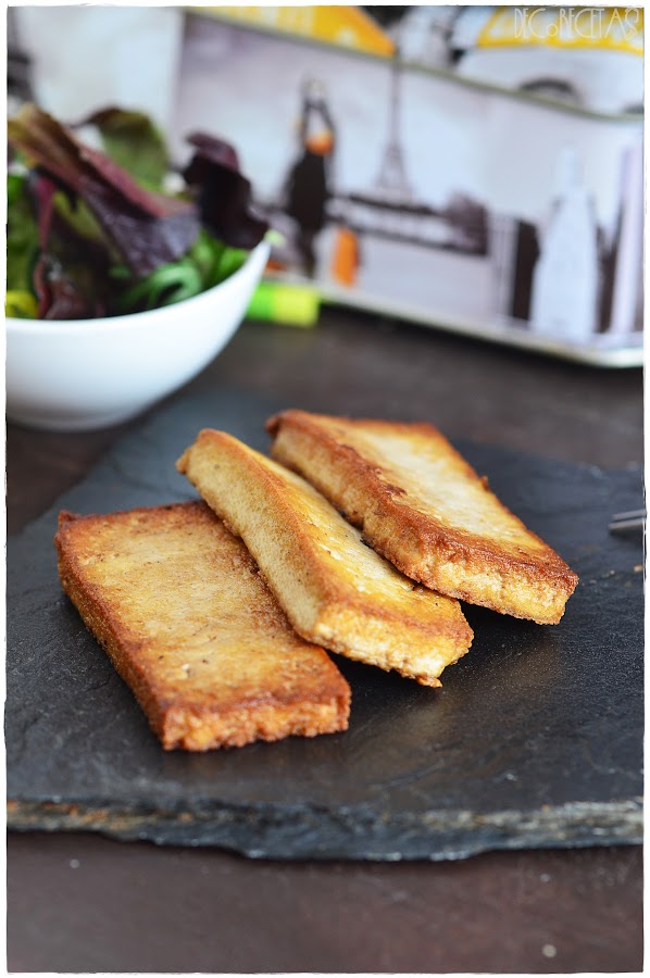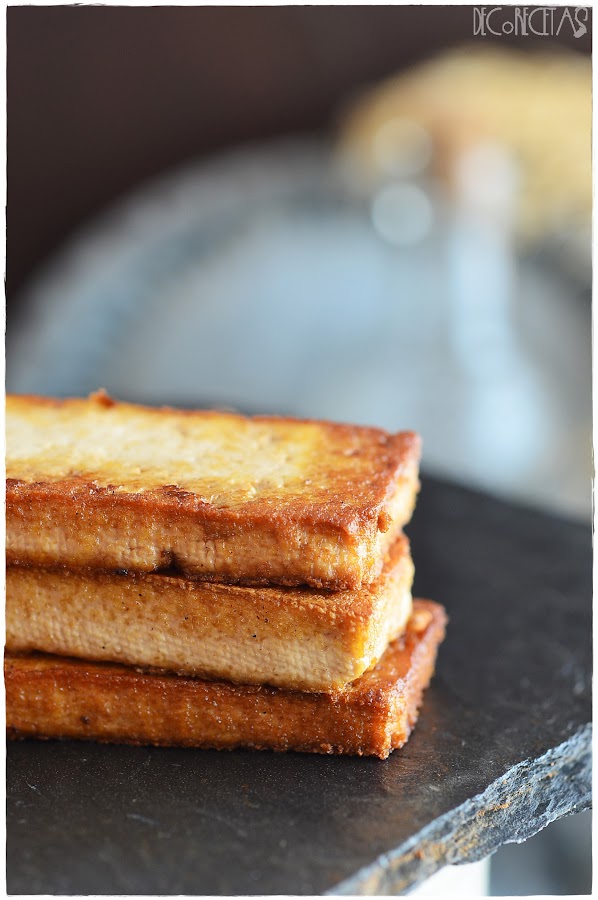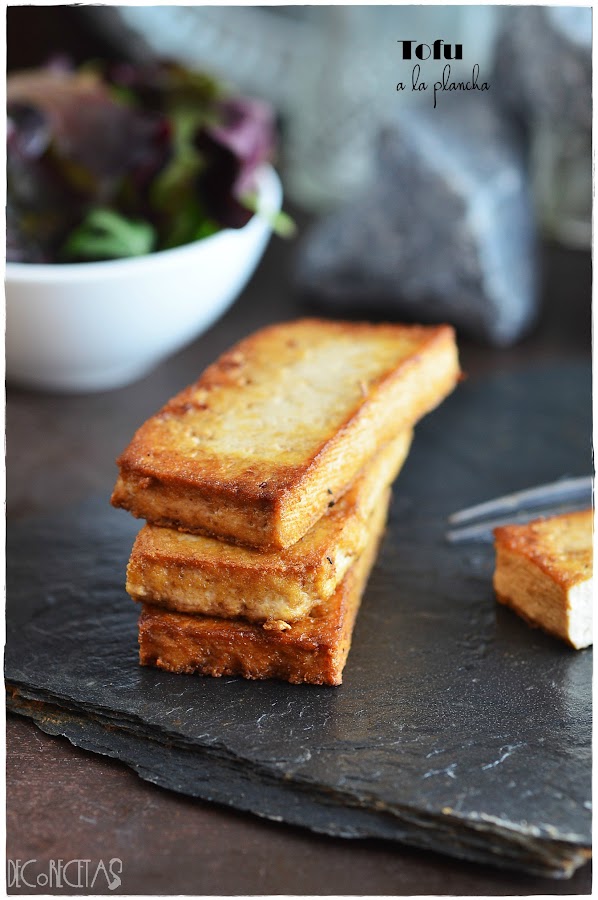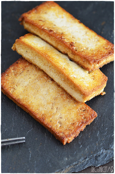 Simplemente, corto en bastones al gusto, e introduzco en un recipiente no muy hondo, añadiendo salsa de soja por encima y unas gotas de edulcorante. Tampoco cubro del todo. Introduzco en la nevera al menos durante media hora para posteriormente pasarlo por la plancha bien caliente con un poco de aceite.